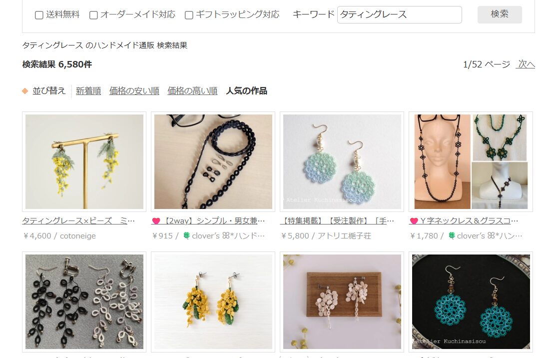 約29万人以上の登録作家数を抱えるクリーマでは、「タティングレース」で検索すると6500件以上がヒットします。類似商品が多数出品されている環境では、作品が他の商品に埋もれてしまい、購入者の目に留まりにくくなる傾向があります。