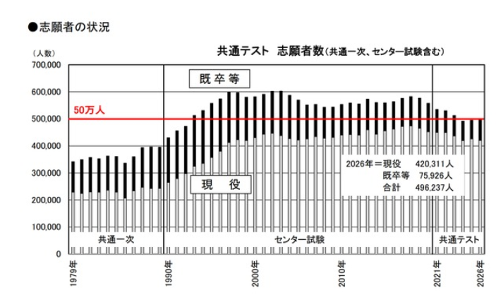 2026年度の共通テストの志願者数は、49.6万人です。(参照:教育業界ニュース
