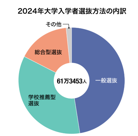 文部科学省によると2024年の大学入学者のうち、一般選抜は47.5%であるのに対し、学校推薦型選抜(47.5%)と総合型選抜(16.1%)を合わせると5割を超える状況です。そのため、総合型・学校推薦型選抜が増加し、年内入試へのシフトしていることが原因です。
